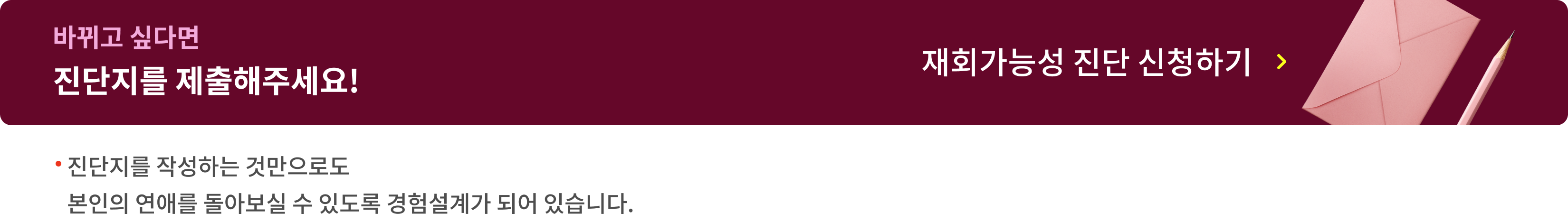 연애의자격 진단지 링크입니다. 진단지를 통해 연애 상담을 받을 수 있습니다. 진단지를 작성하는 것만으로도 본인의 연애를 돌아보고 있도록 경험설계가 되어 있습니다.